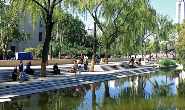改造设计中,我们在沿湖的一圈以廊架、台阶、水景设置多个新的中心。新的中心成为新的舞台,老人和孩子以及其中的每个人既是演员又是观众。同时我们拆除驳岸,使人可以来到水边,亲近水面,湖心岛被恢复为生态岛,水鸟重新在上面安家。随着周边城市土地的开发,这个城市的中心公园变成了居住区公园,住户在阳台上便可鸟瞰全园。