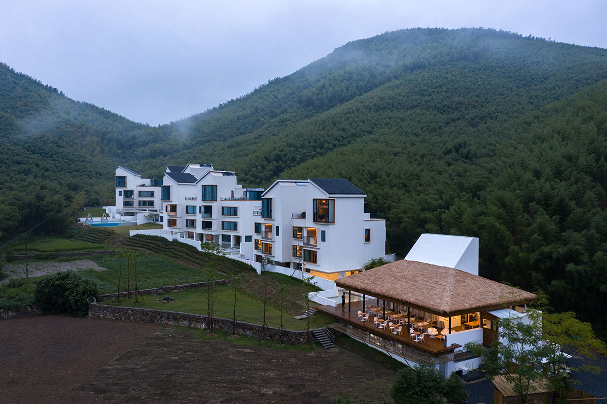我们将建筑沿着山和田的边界布置,随着山势而有机展开。在设计中确保每一户都有东西两侧的大面积开窗,让风景自然流入室内,在坐在窗台上打开窗就可以拥抱最美的莫干山。